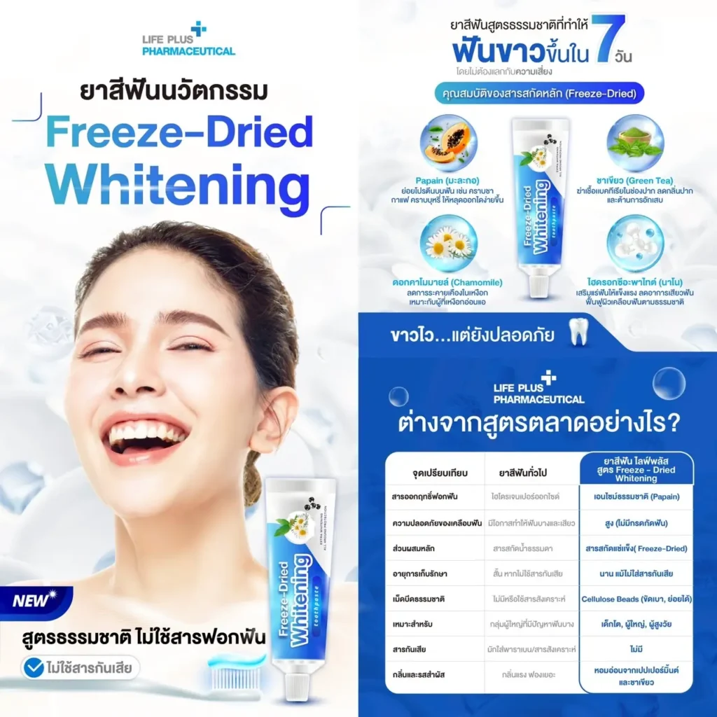 1. ไม่มีสารฟอกฟัน (Peroxide-free) แต่เห็นผลฟันขาวขึ้นใน   5–7 วันด้วยเอนไซม์ธรรมชาติ (Papain) + ผงขัดอ่อน